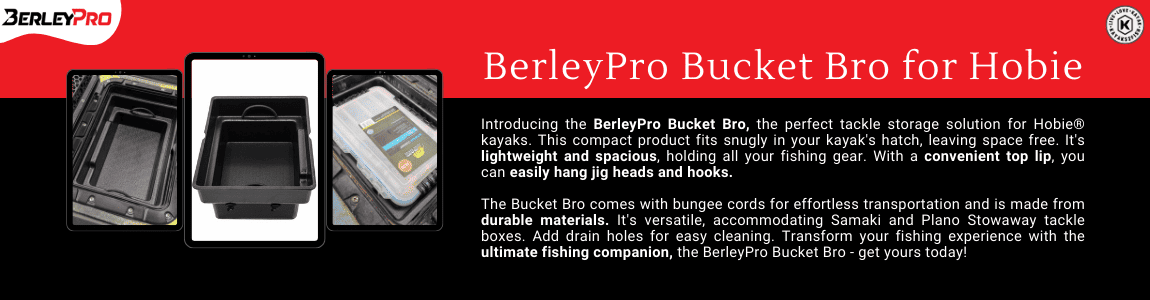 Introducing the BerleyPro Bucket Bro, specially crafted to fit snugly inside Hobie® kayaks' rectangular hatches. This shallow tackle storage solution is designed with practicality in mind, featuring a lip around the top and a depth of only 100 mm to ensure it seamlessly integrates without hindering kayak space. The Bucket Bro accommodates Samaki jig boxes and Plano Stowaway for organised fishing adventures.