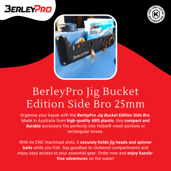 Introducing the BerleyPro Jig Bucket Edition Side Bro 25mm, a versatile storage solution to keep your kayak or boat organised and clutter-free. Made in Australia from high-quality ABS plastic, this side bro is precision-crafted for durability and functionality. It easily fits into Hobie® mesh pockets or rectangular boxes.