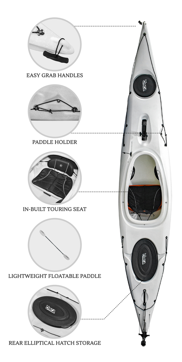 - Touring seat sits off the floor of the kayak so you do not get a wet bottom