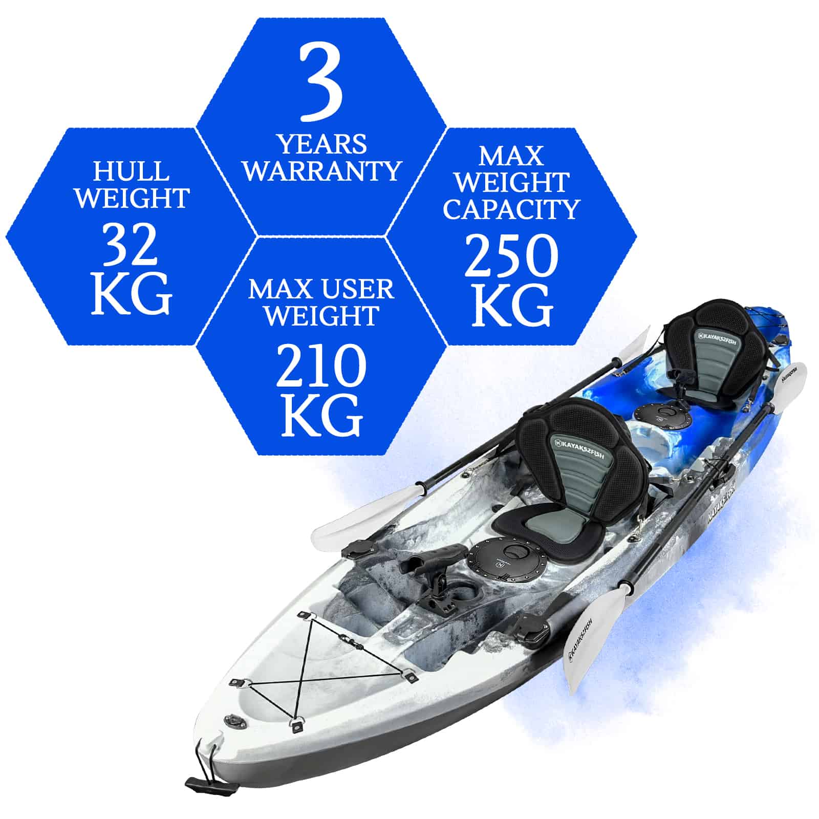 The Eagle Kayak has a Max user weight of 210Kg and a max weight capacity of 250Kg.