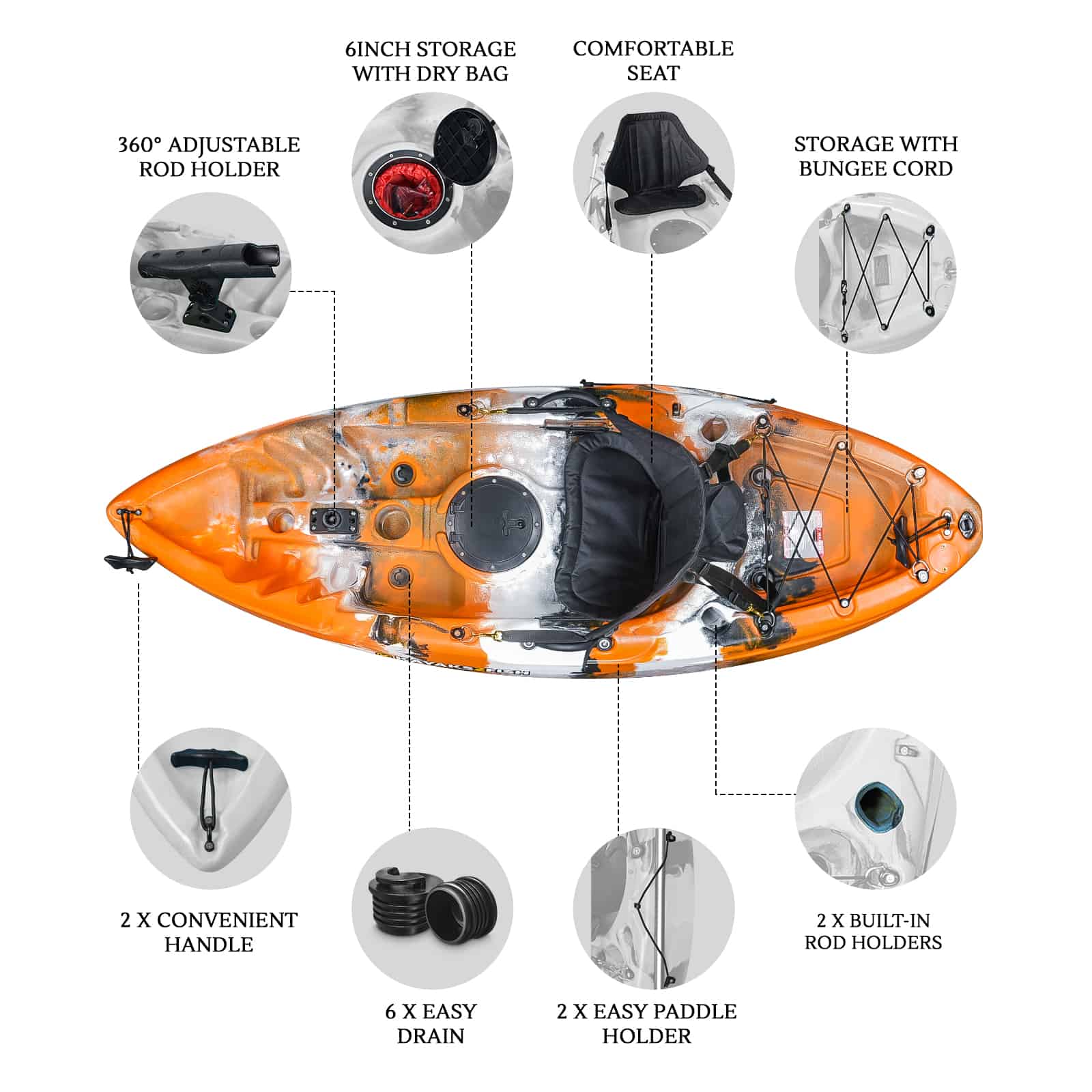 Include seat, paddle, paddle leash & swivel rod holder