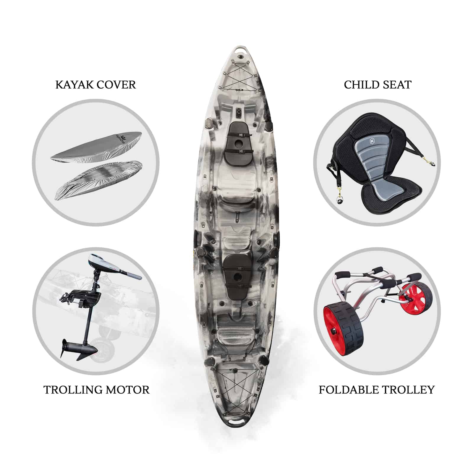 - Built-in third child seat position in the middle of the kayak. Kayak accommodates two adults + a child. The middle seat can also be used when Kayak is used by a single person*. (Please note padded seat for the child is not included. It can be purchased at an extra cost).