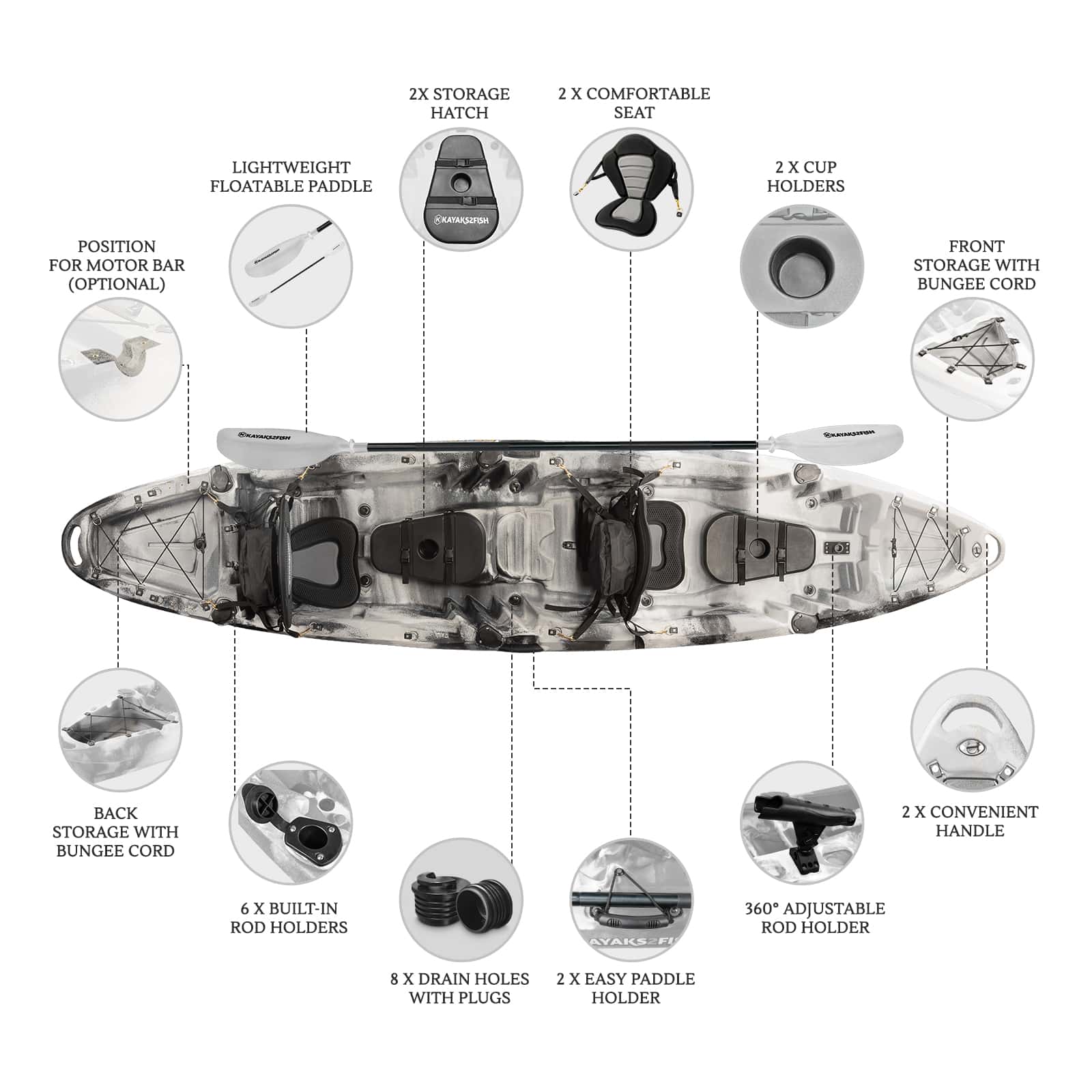 - Scupper holes with drain plugs around the body of Kayak for easy drainage if needed.