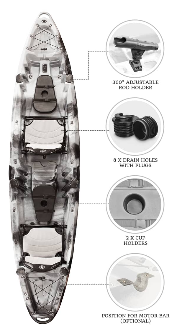 - Scupper holes with drain plugs around the body of Kayak for easy drainage if needed.
