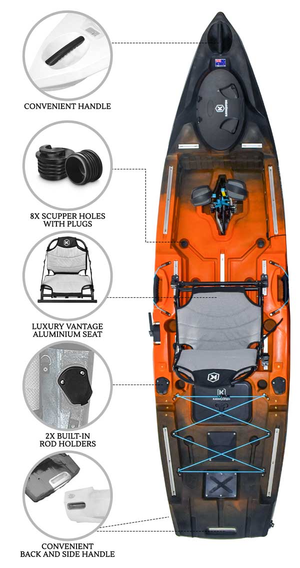 The Max-Driveâ„¢ Pedal drive allows fast but smooth-and-easy pedal acceleration and stopping; whether travelling long distances between fishing spots or for nuanced kayak positioning while sneaking up on the big ones. Lightweight premium pedal power is at your back and call to hit every one of your secret spots and then get home quick against wind and tides.