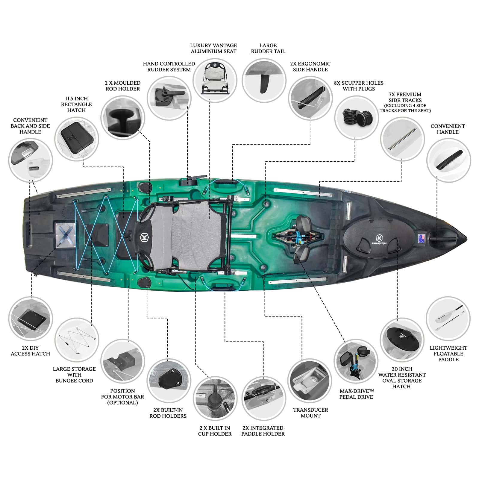 The Max-Driveâ„¢ Pedal drive allows fast but smooth-and-easy pedal acceleration and stopping; whether travelling long distances between fishing spots or for nuanced kayak positioning while sneaking up on the big ones. Lightweight premium pedal power is at your back and call to hit every one of your secret spots and then get home quick against wind and tides.