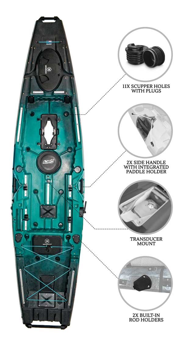 The Max-Driveâ„¢ Pedal drive allows fast but smooth-and-easy pedal acceleration and stopping; whether travelling long distances between fishing spots or for nuanced kayak positioning while sneaking up on the big ones. Lightweight premium pedal power is at your back and call to hit every one of your secret spots and then get home quick against wind and tides.
