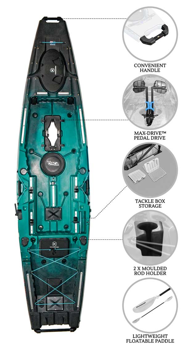 The Max-Driveâ„¢ Pedal drive allows fast but smooth-and-easy pedal acceleration and stopping; whether travelling long distances between fishing spots or for nuanced kayak positioning while sneaking up on the big ones. Lightweight premium pedal power is at your back and call to hit every one of your secret spots and then get home quick against wind and tides.