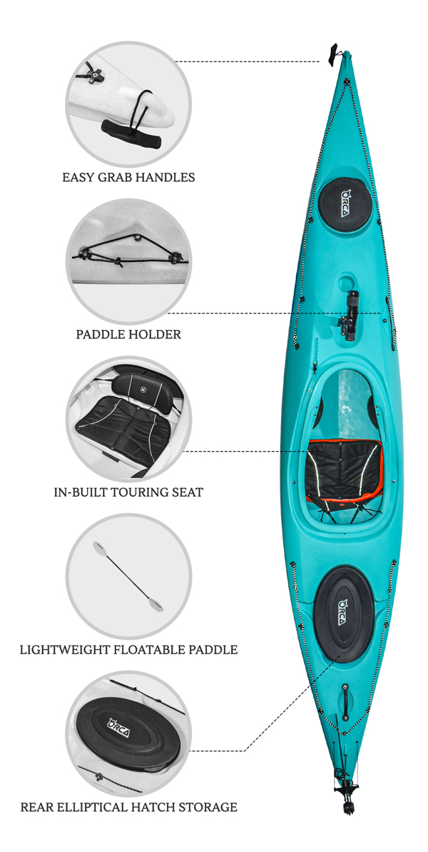 - Touring seat sits off the floor of the kayak so you do not get a wet bottom