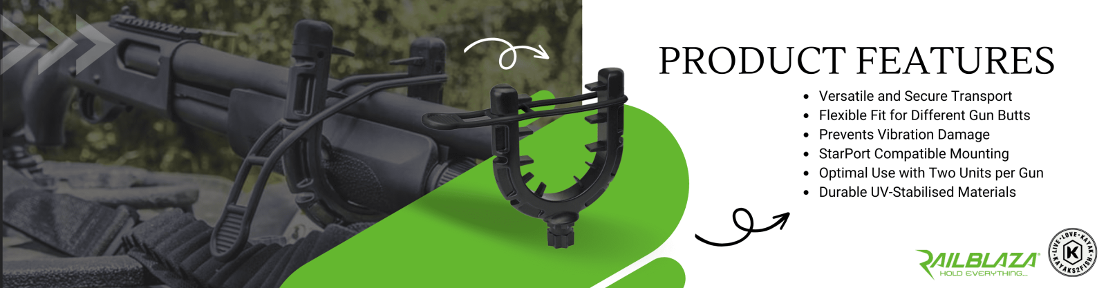 In summary, the Railblaza GunHold allows you to safely transport rifles, shotguns, bows, fishing rods, and other gear in various outdoor environments. Its robust construction from UV-stabilized AES plastic and TPE rubber offers exceptional durability and versatility adapting to the stock shape of different firearms or other equipment. The secure strap system minimizes vibration which causes potential damage when covering long distances. The convenience of its design allows for quick attachment or detachment making it an indispensable tool for hunters, outdoor enthusiasts, and sport shooters. Get yours today!