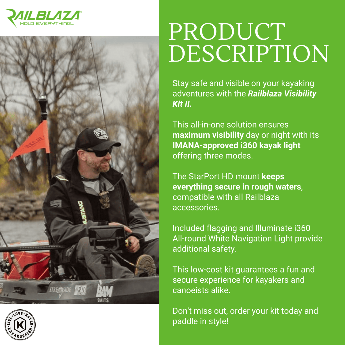 Introducing the Railblaza Visibility Kit II - a must-have safety item in the kit of any kayak angler or recreational paddler. This kit is designed to keep you safe and visible on the water, day or night.
